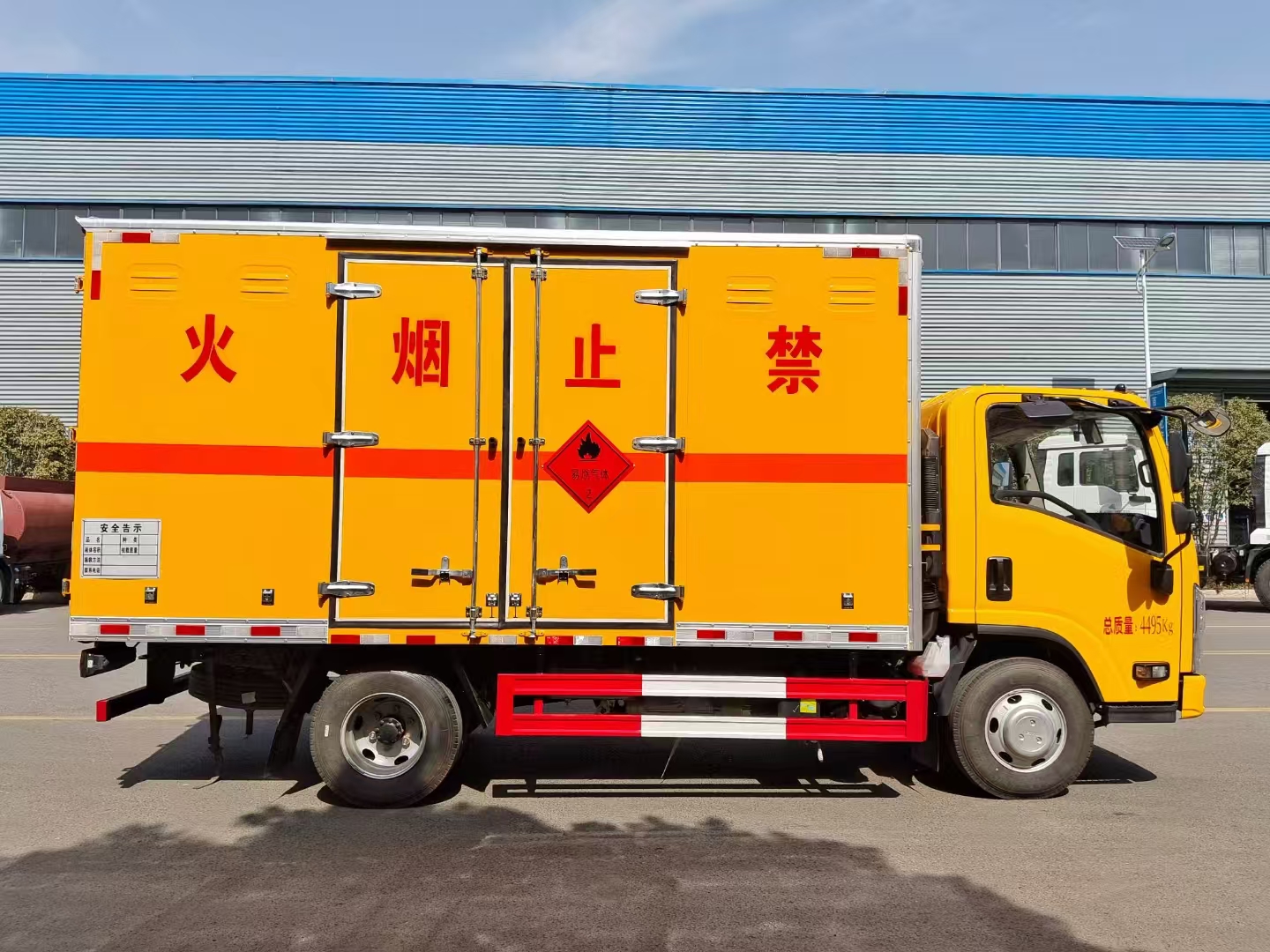 | 貨箱配置 | 廂體為雙層金屬骨架結(jié)構(gòu),外板采用冷軋鋼板,中間填充阻燃泡沫,內(nèi)飾為鋁板。底板為平板上鋪防靜電膠皮。廂內(nèi)兩側(cè)加裝固定貨物臥環(huán),門框帶防盜報警器,頂部帶煙霧報警器,廂體右側(cè)選裝側(cè)門,隨車配2個滅火器,危險標志牌,防火帽,危險品三角頂燈。 (選裝瓦楞板貨箱) (尾部可選裝液壓升降尾板) | ||